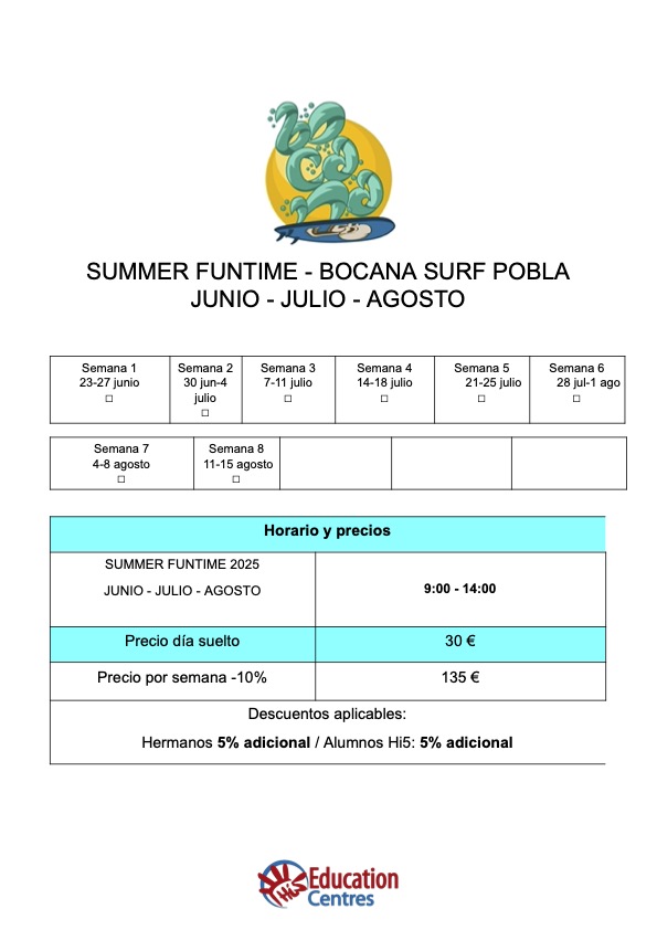 - Bañador, camiseta licra, chanclas, gorra, toalla playa, mochila, almuerzo y agua, zumo o refresco